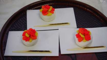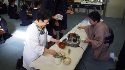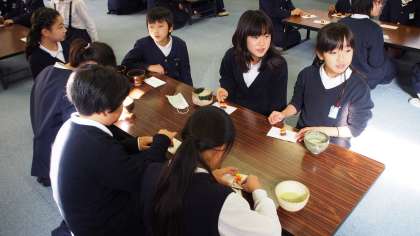 地域の方の指導で5年生が茶道体験をしました。「和敬清寂」という茶道の心得についてのお話を聞いたあと、季節の和菓子と抹茶をいただきました。