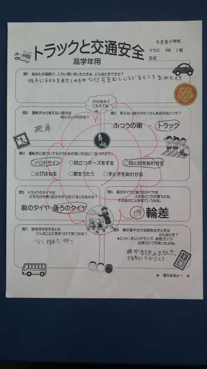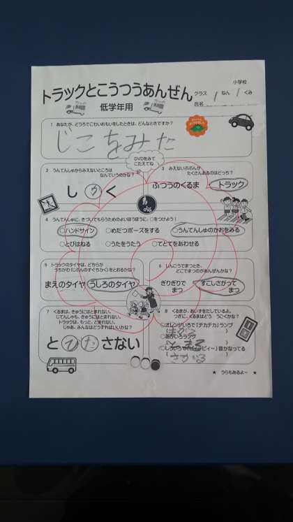 先月の交通安全指導の一環で、子どもたちのプリントを西警察署交通安全課のみなさんに見ていただきました。DVD「トラックと交通安全」を視聴後、全児童で取り組みました。一枚一枚に丁寧にコメントをいただいています。お忙しい中、本当にありがとうございました。夏休み前に子どもたちに渡して、復習をしておきたいと思います。