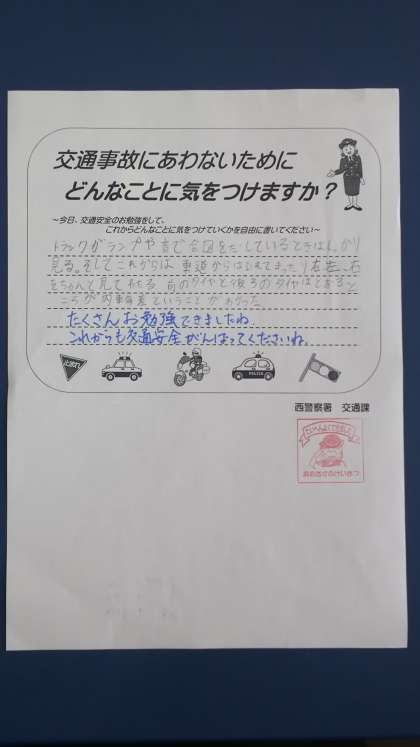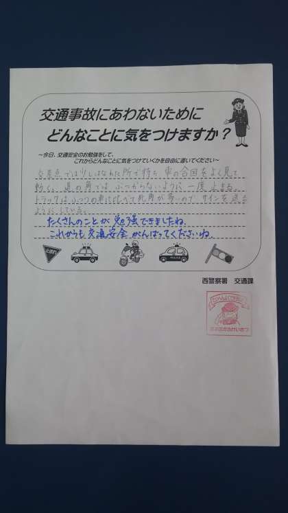 ※今回のプリントを通して、学年が上がるとともに活動範囲も広がり、様々なたくさんの経験をしていることがとてもよくわかりました。今後の子どもたちへの交通安全指導に活かしていきたいと思います。