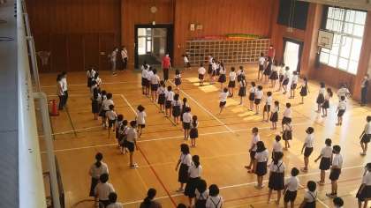 ※右の写真は退場時のものです。班ごとに縦に並んだ後、1年生から順番に退場します。写真は最初の1年生が退場する時のものです。
