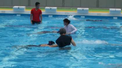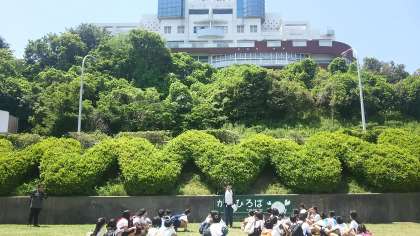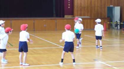※左の写真は一昨年の一泊移住の時の写真です。山上の建物は避難場所に指定されている「海風館」です。今年の5年生の一泊移住は9月28日(月)と29日(火)に行う予定です。中央は1年生、左は6年生の7月31日(金)の体育の授業です。