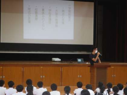 今の学年になってから今日までの1学期の間で、皆さんはずいぶん成長しています。6年生は最高学年らしくなってきています。引き続き、全員の力を合わせて、一人ひとりが学校のみんなのお手本になる、思いやりにあふれる6年生になってほしいと思います。5年生から1年生も、その学年の児童らしくなりました。とてもうれしく思います。