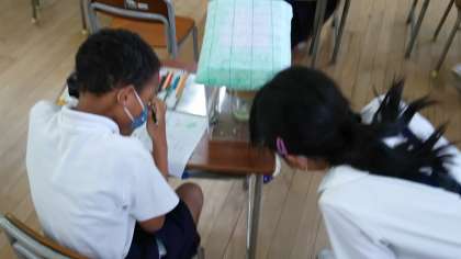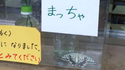 ・今朝〔8月27日(木)〕、サナギがきれいなアゲハチョウになっていました。報告が遅れましたが、サナギの名前は始業式の日に「まっちゃ」に決まっています。