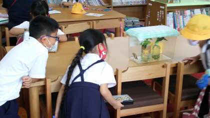 ・昨日〔8月27(木)〕の放課後、大きくてきれいなアゲハチョウに育った「まっちゃ」の飼育ケースを図書室へ運び、いきいき教室に来ていた他学年の子どもたちと一緒に空へ放ちました。たくさんの子どもたちが見守る中、「まっちゃ」は4階の窓からさらに高く、元気よく飛んでいきました。