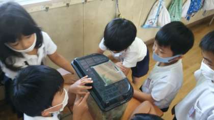 ・昨日〔8月31日(月)〕の朝、子どもたちに渡しました。休憩時間に教室に行くと「コロコロコロと鳴いたよ」「エサ(ナスビとキュウリ)を食べてるよ」と教えてくれました。