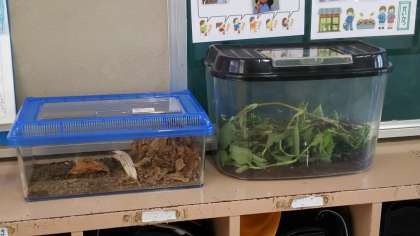 ※下の写真の左のケースにダンゴ虫、右のケースでコオロギを飼育・観察しています。