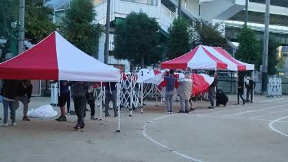 ※写真は昨年度〔令和元年10月13日(日)〕のものです。左の写真は早朝の6時半過ぎにテント張り等を保護者のみなさんが手伝ってくださっている様子です。前日に激しい雨が降り、事前準備ができなかったため、早朝の作業となりました。