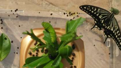 ※下の写真の右上のサナギの上に蝶々が止まっています。真ん中のミカンの枝には緑色の5齢幼虫が2匹、写っています。5匹目も順調に育ち、5齢幼虫になりました。