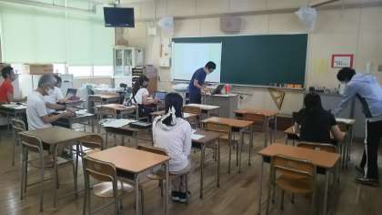 校内でも家庭と学校を繋いで授業を行うための研修を進めています。新型コロナウィルス感染症による突然の学校休業や放課後の自主学習指導など、色々な形での活用が考えられています。