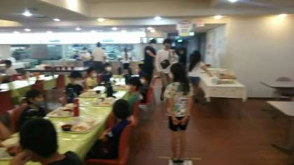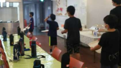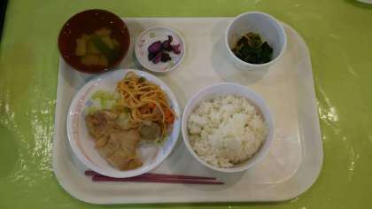 施設内での食事は、配膳時には一人ひとり距離をとって並ぶよう床に線が引いてあったり、食べる際も向かい合う席が交互になるよう配置されたりしています。