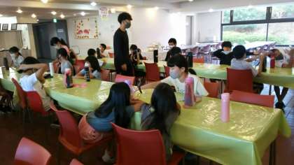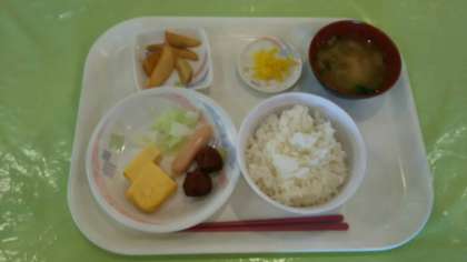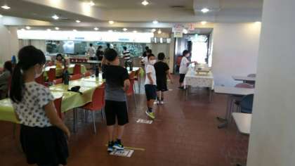 今回も配膳時に前後で間隔をとって並びましたが、昨日の夕食で経験しているので、スムースに準備ができました。