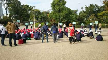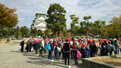 子どもたちが出発する頃までは曇り空でしたが、今回の目的地である大阪城公園に着いた頃から愛空が広がり出し、絶好の遠足日和をなりました。