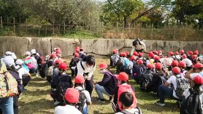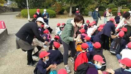 ・消毒液を公園へ持参しており、複数回、手の消毒を行っています。担任の先生から一人ひとりに消毒液を手に付けていきます。