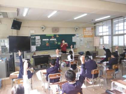 ・授業の終わりの方では、「?(はてな)ボックス」を使って、三食栄養素の学習をしました。「?ボックス」の中には色々な食品のカードが入っており、黒板に貼ってある「げんき号」の三つのコーナーに楽しそうに貼っていきました。このゲームは子どもたちに大人気のゲームです。