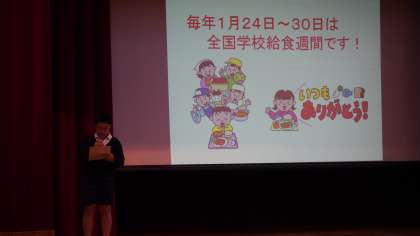 給食委員会が児童集会で学校給食の歴史や給食に関するクイズを発表しました。明治22年に山形県で学校給食が始まったこと。戦争が終わった昭和21年に外国から送られた缶づめやミルクによって給食が再開されたことなどを学びました。給食委員の発表のあと、給食調理員さんのお話も聞きました。