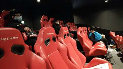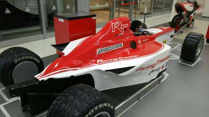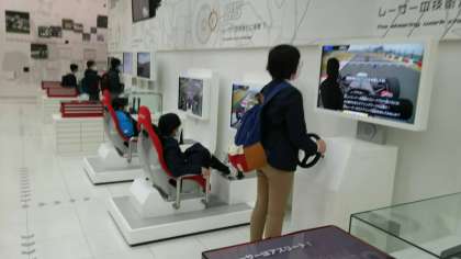 実際に爆音を響かせて走るレーシングカーを見た後、併設しているレーシングシアターでレース体験をするグループもありました。