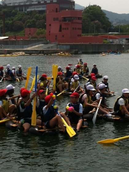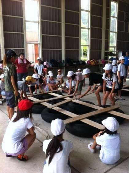 グループで協力して、いかだを組み立て海岸まで運びました。