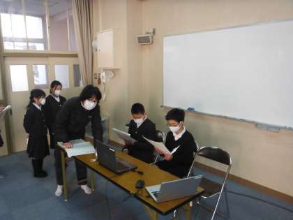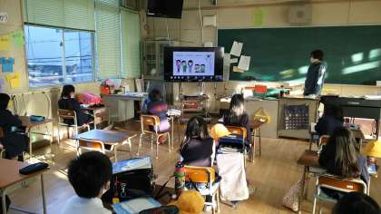 ・今朝の児童集会はけんこう委員会の発表でした。テーマは「手あらいで バイバイ ウイルス」でした。リモート授業のシステムを使って、多目的室から教室へ配信しました。