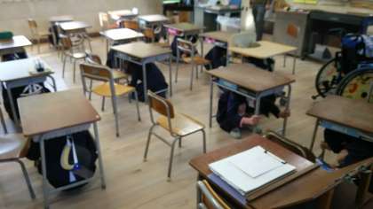 ・9時に地震発生の訓練放送があり、本日の防災学習がスタートしました。1次避難として、机の下に身を隠し、2次避難として運動場へ移動しました。