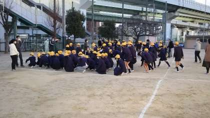 ・全児童が真剣に取り組み、2分台で運動場に集合し、点呼が終了しました。