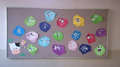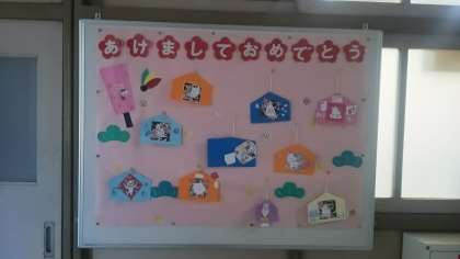 ・上の写真はなかよし教室前、下の写真は2階の2年生の掲示です。どちらも一つ一つの作品が丁寧に作られており、全体ではとてもお正月らしい掲示に仕上がっています。