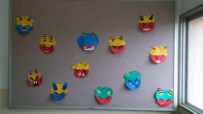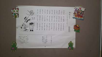 ・お正月らしい、詩「年めぐり」(下の写真:しりとりうた)に加えて、1年生たちが作った「おに」たちが掲示されました。色とりどりでとてもきれいですが、今日〔2月2日(火)〕は節分です。悪い「おに」が混じっていたら、1年生たちの元気で退治したいと思います。