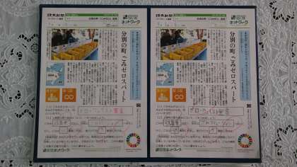※上と中央の写真は3年生と4年生が取り組んだワークシートを2年生が見ているところです。下の写真は4年生のSDGs版ワークシート通信「分別の町 ごみゼロ宣言」です。