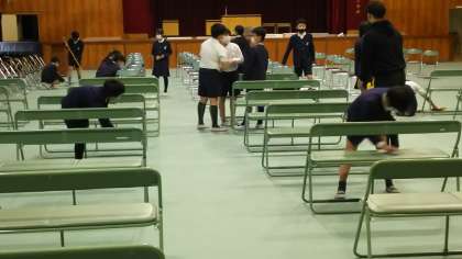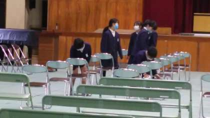 ・昨日〔3月5日(金)〕の1校時、5年生が卒業式の会場設営を行ってくれました。例年であれば、5年生は在校生代表として、卒業式に出席するのですが、今回も昨年に引き続き、感染症対策の為に出席できません。シートを敷いて、椅子を並べ、掃いたり、拭いたり、心を込めて準備してくれました。