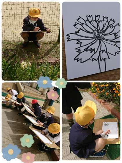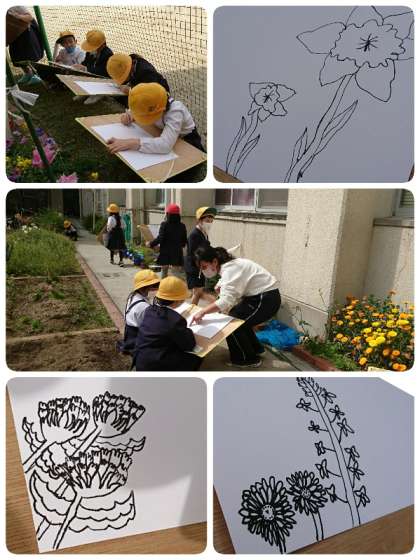 3年生の子ども達が、学習園でお花のスケッチをしていました。たくさんの種類の花が咲いています。菜の花・チューリップ・ラッパスイセン・キンギョソウ・キンセンカ・ラナンキュラス・アネモネなど、一つ一つの花の特徴をとらえて描いていました。先生にたくさんほめてもらって、ニコニコの笑顔になりながら、よりいっそうがんばって描いている姿がとてもかわいかったです。