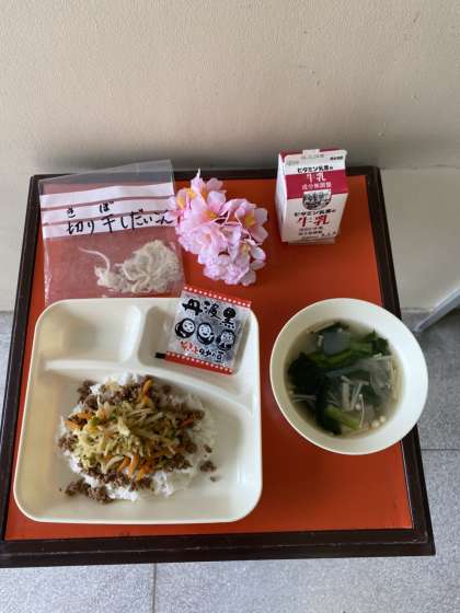 今日のメニューは、ビビンバ・トック・いり黒豆・牛乳でした。ビビンバは、切り干しだいこん・きゅうり・にんじんと、野菜が具だくさんでした。お肉はコチジャンやニンニクで風味よく味つけされていて、ごはんとよく混ぜていただきました。ごま油やごまの風味もあり、とってもおいしかったです。トックは、薄味で仕上がっていて、ビビンバとぴったり合っていました。おもち(トック)はもちもちでした。今日もおいしくいただきました。