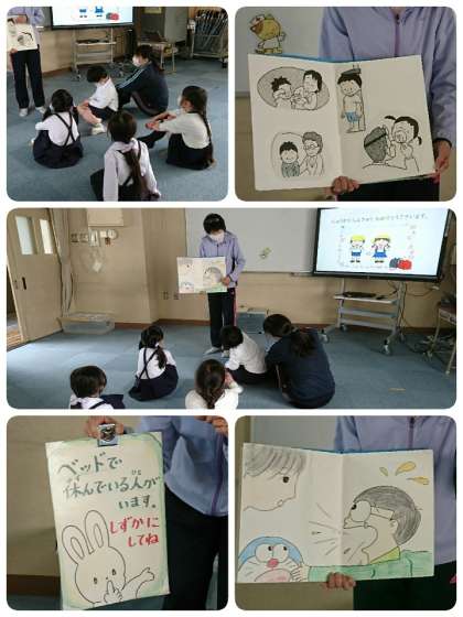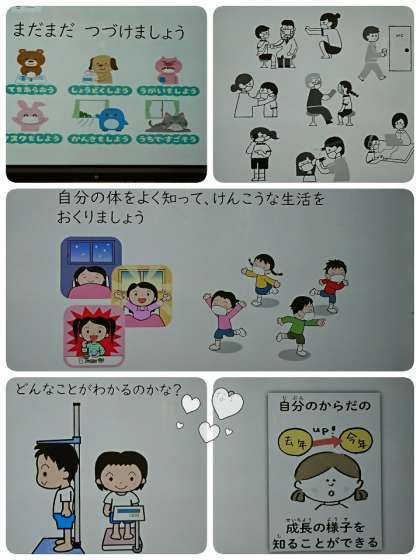 入学して初めての発育2測定を多目的室で行いました。まず、保健室の先生から、けがをしたときは・・・、保健室に来るときは・・・など、いろいろな約束についてお話をしてもらいました。次に、コロナから自分の体を守るために、これからも手洗い・消毒などを続けていきましょうとお話がありました。さらに、健康な生活を過ごすためには、早寝・早起きなど規則正しい生活や運動することが大切ですよと教えてもらいました。