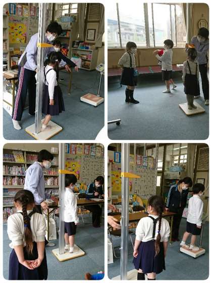 さあ、いよいよ測定です。身長と体重を測りました。順番を守って静かに測定をすることができました。花丸です。(*^^)v