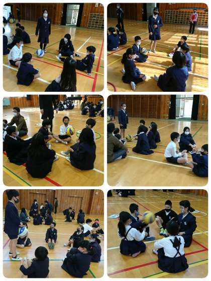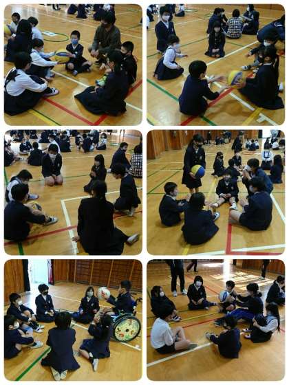 たてわり班で円になり、ウッドブロックが鳴っている間は右回りに、トライアングルが鳴っている間は左回りにボールを回していきます。シンバルが鳴ったらその時にボールを持っていた子が、自分の学年・学級・名前を言って自己紹介をします。次々にみんなの自己紹介が終わったら次は自分の好きな食べ物を言いました。自己紹介をした後に、みんなから自然と拍手が起こりました。これから1年間、どうぞよろしくお願いします。