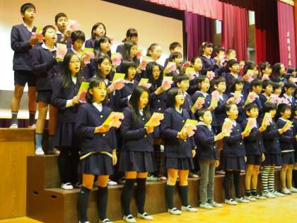 5、6年生は呼びかけのあと、唱歌「ふるさと」を心をこめて合唱しました。各学年の発表を子ども達だけでなく、保護者の方も感慨深く見ておられました。その後、全員で「みんなトモダチ」という歌と校歌を合唱しました。