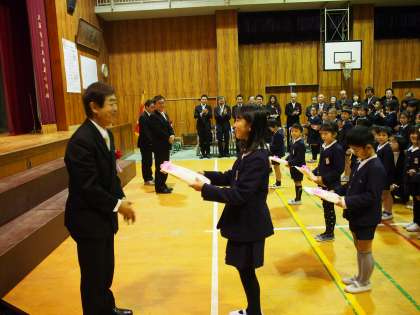 最後に記念事業実行委員会から記念事業目録と、児童記念品の贈呈がありました。PTAや地域の皆様のご支援により、子ども達の記憶に残る素晴らしい集会にすることができました。