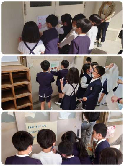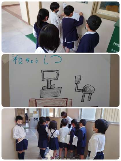校長室にいると、廊下からかわいい話し声が聞こえてきました。廊下に出てみると、1年生と2年生が、学校たんけんの練習をしていました。今日は、校長室や職員室、保健室などの扉にそれぞれの部屋の様子を描いた絵を貼っていきました。