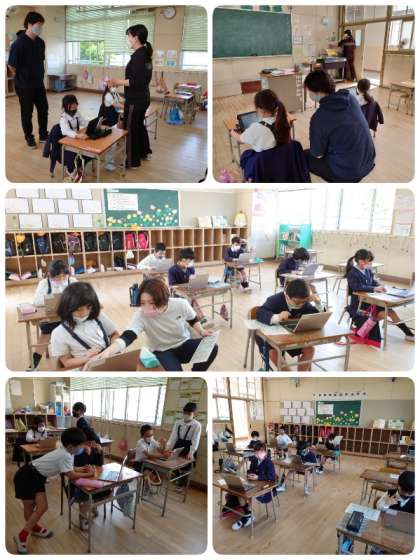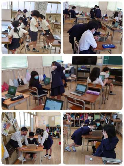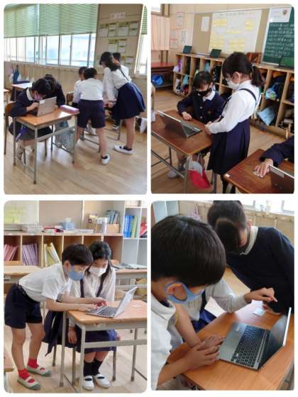 登校してきた子ども達から、パソコンを使ってTeamsのサインインをしました。昨日の段階では、大阪市のたくさんの小・中学校がアクセスしたためにパンク状態になってしまい、ほとんどつながらなかったので再チャレンジしました。3・4年生は、友達と協力して助け合いながら作業をしていました。とても親切で仲良しな子ども達です。