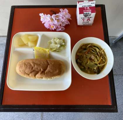 今日の給食は、カレースープスパゲッティ・キャベツのピクルス・りんご(カット缶)・パン・アプリコットジャム・牛乳でした。