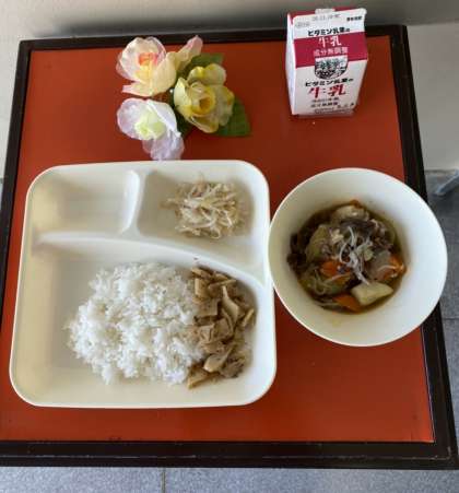 今日のメニューは、肉じゃが・もやしのゆずの香あえ・ごまかかいため・ごはん・牛乳でした。肉じゃがは、じゃがいもがホクホクで、おいしい出汁が中までしみ込んでいました。もやしのゆずの香あえは、さっぱりしていて、ゆずの香りがさわやかな1品でした。ごまかかいためは、ごはんに混ぜると「たけのこごはん」みたいでした。風味がよくてとてもおいしかったです。今日もおいしくいただきました。