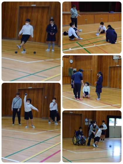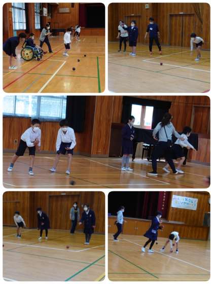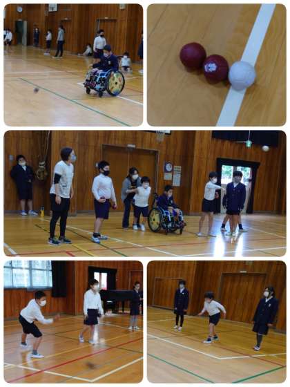 今日のなかよしタイムは、「ボッチャ」にチャレンジです。最初、多目的室でDVDを見て、ルールを確認しました。その後に体育館へ移動。まずは、目標のラインを決めボールを投げてみました。子ども達はすぐにコツをつかんで投げることができるようになったので、さっそくゲームをすることになりました。先生がルールを説明しながらゲームにチャレンジ。目標のボールに向かって自分のボールを投げていきます。ボールが目標に近いところで止まったら子ども達は大喜び!!チャイムが鳴った後に「もっとやりたかったなぁ」と感想を言っている子もいました。また一緒に楽しもうね。