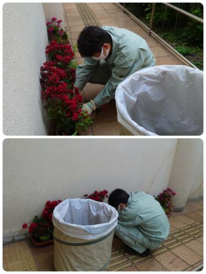朝から管理作業員さんが、玄関のカランコエの花のお世話をしていました。枯れて少し色が変わったお花を摘んだり茎を切ったりすると、また次々と花が咲くそうです。花がいっぱいの玄関で、毎日子ども達を迎えることができます。