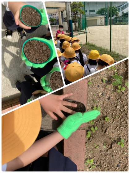 3年生がホウセンカとマリーゴールドの種を植えていました。種の上にそっと土を被せました。元気に成長してくれるといいですね。