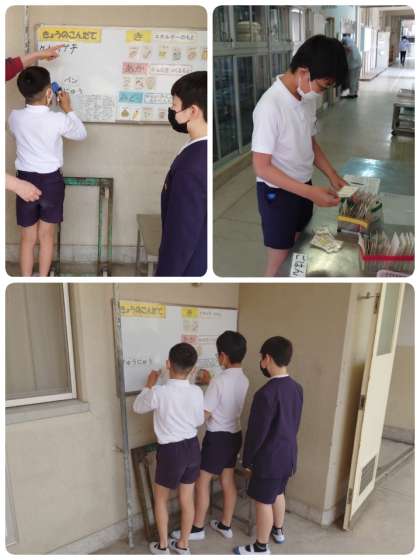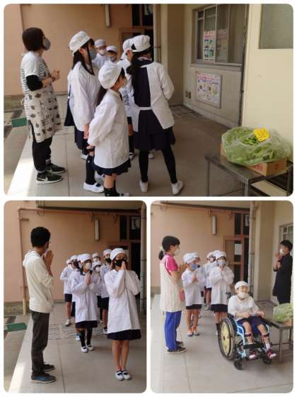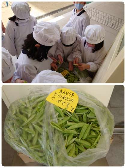 今日の給食で、生のえんどう豆を使った「えんどう豆の卵とじ」がでました。子ども達も見ることができるように、給食室の前にえんどう豆のさやを置いてくれました。3年生の子ども達は、わいわい言いながらさやを観察していました。中には小さいえんどう豆が残っているものもあり、見つけた子どもはすごくうれしそうにしていました。子ども達の素直な行動に思わず微笑んでしまいました。(*^-^*)