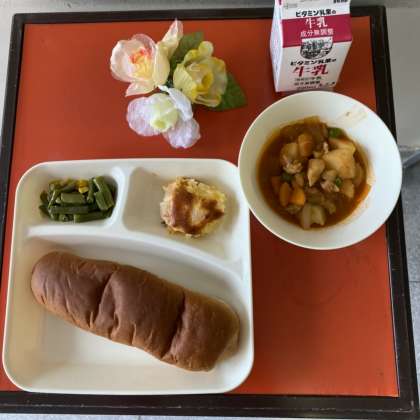 ケチャップ煮には、鶏肉・じゃがいも・玉ねぎ・にんじん・グリーンピースが具材として使われ、トマトピューレを中心に美味しく煮込まれていました。また副食であるりんごのクラフティは子ども達の好評メニューの1つで、りんご以外にももも使われることがあります。ちなみにクラフティーとは、フランス語で「いっぱいつめる」という意味で、今日もたくさんのりんごがつまっていました。