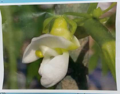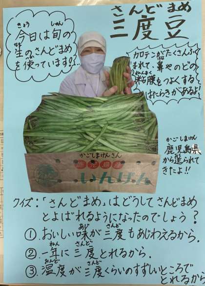 ※今日の給食クイズの問題であるさんど豆の由来は、2番の「1年に3回収穫できる」で、写真の様に白い花を咲かせます。