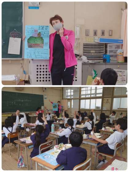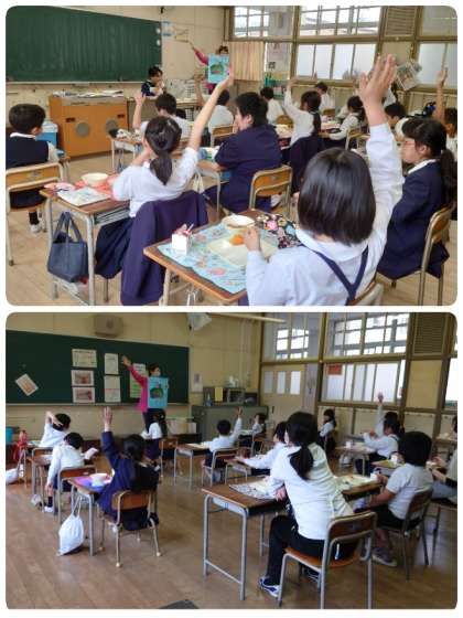 今日の給食のメニューで、生のさんどまめを使った「さんどまめとコーンのソテー」がありました。栄養士の先生が、1〜4年生の教室を回って「さんどまめのクイズ」を出してくれました。「給食中なので、静かに聞きましょう。」とお話がありました。子ども達は、先生が出してくれるクイズを聞いて、3択で考えました。正解した子ども達のガッツポーズがかわいかったです。