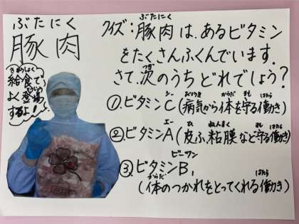 今日のすまし汁に使われている湯葉は、豆乳を煮て、表面にできた薄いまくを引き上げて作られます。また、引き上げて水分を切っただけの「生湯葉(なまゆば)」と生湯葉を乾かした「干し湯葉」があります。今日の給食では「干し湯葉」が使われていますが、たんぱく質や脂質、カルシウム等の栄養素がたくさん含まれています。豚丼の豚肉にもビタミンB1が含まれていて、今日もしっかりとたくさんの栄養素を吸収しています。