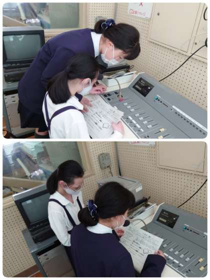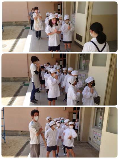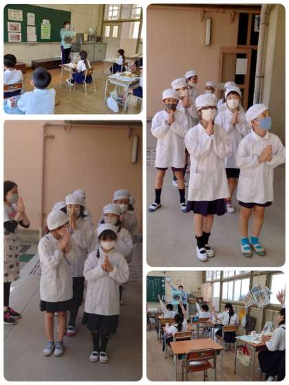 給食の時間のはじめに、今日のメニューや食材のことについて放送が入ります。給食委員会の子ども達が、給食室でのお仕事をした後に放送室に移動して、毎日放送しています。今日は、6年生が5年生に放送機器の使い方を説明しながら、ていねいにアドバイスをしていました。優しさがあふれている6年生です。もちろん5年生の子どももがんばっていましたよ。