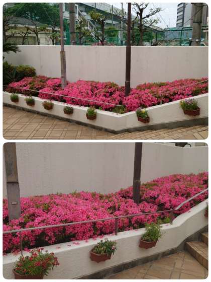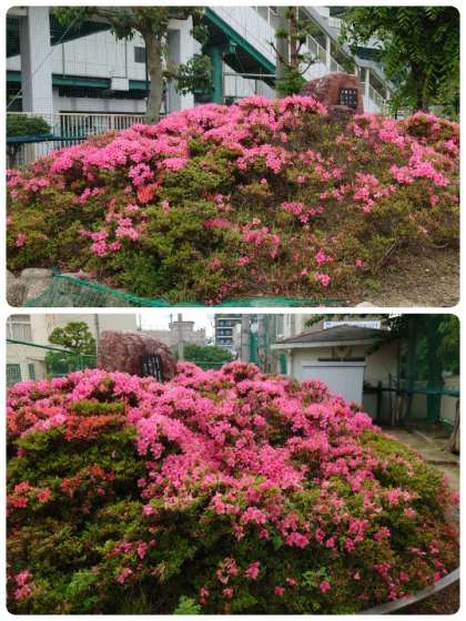 学校の正門横の花壇と築山のツツジが満開になってきました。色が鮮やかでとてもきれいです。ご来校の際にアジサイと一緒に見てください。