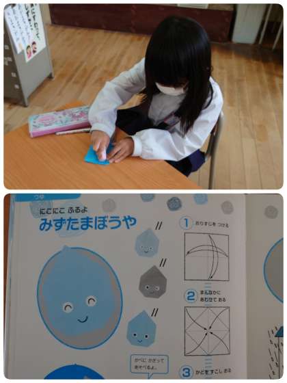 この日曜日から梅雨に入りました。例年よりもずいぶん早い梅雨入りですね。1年生の子ども達が、掲示物を作成していました。梅雨の時期にぴったりの「みずたまぼうや」です。折り紙で形を作った後に、顔を描きました。いろいろな表情の「みずたまぼうや」のできあがりです。